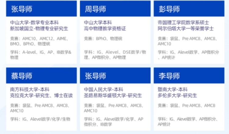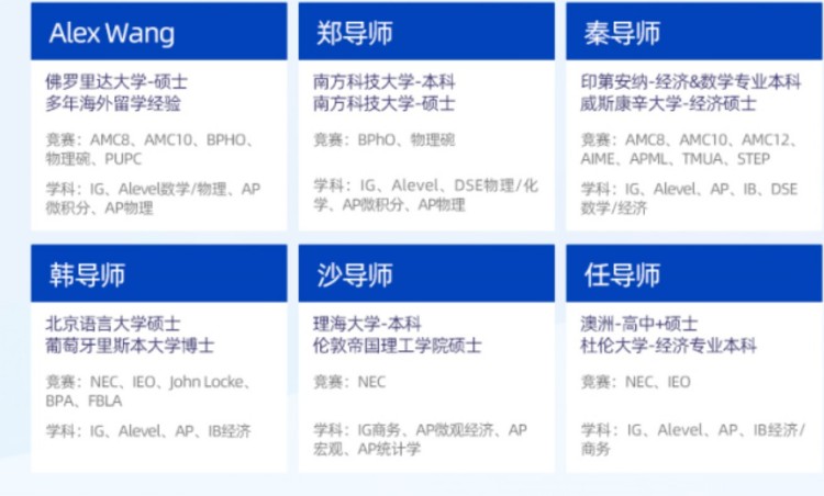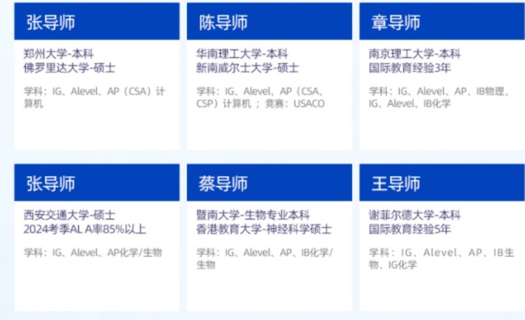 训师资团队的老师毕业于全球TOP院校,包括:剑桥大学、帝国理工、新加坡国立等藤校G5院校。教师团队通过层层严格选拔和持续的培训,保障高质量和稳定的教学输出。具有丰富的IG/ALevel教学经验,深谙考试题型变化,助力学生在考试中取得高分。