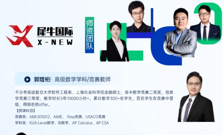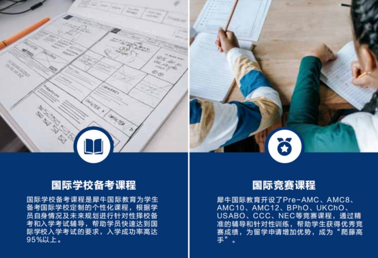 犀牛国际教育主要提供国际教育的相关咨询规划与培训,根据孩子未来的实际需要,在学科同步辅导、竞赛培优冲奖、G5牛剑笔面、国际择校、强基培训与研究生考试辅导等方面综合规划,为孩子进行同步辅导和培优,帮助孩子在最短时间内提升硬实力,拥有更加突出的背景,在未来申请学校中脱颖而出。