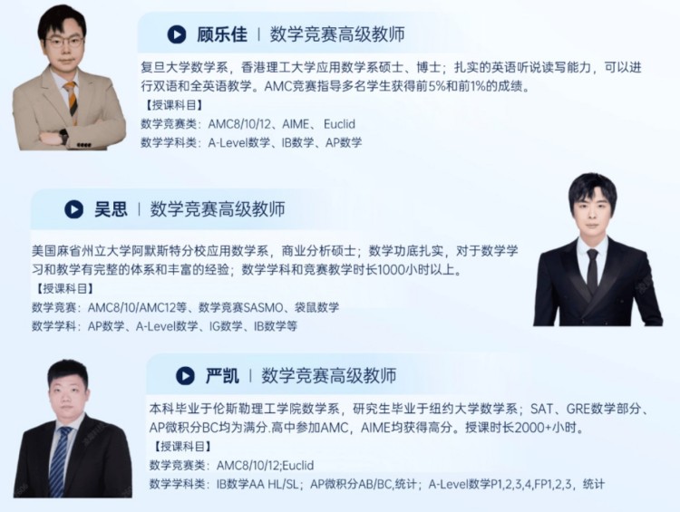 竞赛针对的是在数学领域有较高天赋和兴趣的高年级中学生,旨在通过竞赛的形式来考察和提升他们的数学能力和逻辑推理技巧,具体来说是11至18岁的学生。课程包含入门(0基础或者刚入门的学生)、强化、冲刺班型。