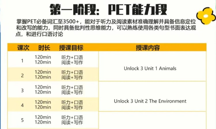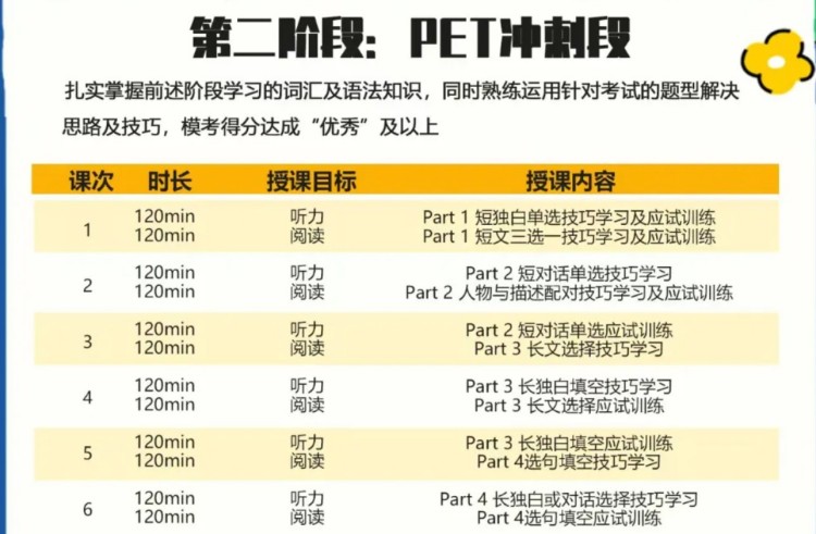 培训班型:PET基础班/PET强化班/PET冲刺班/灵活安排