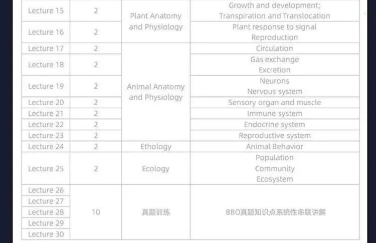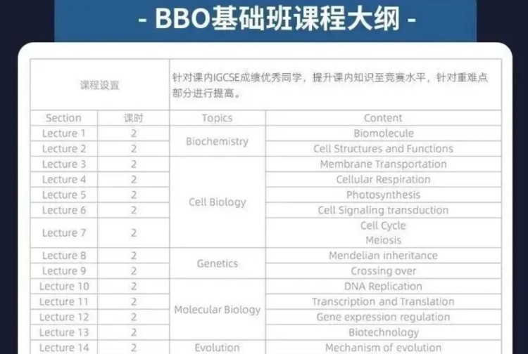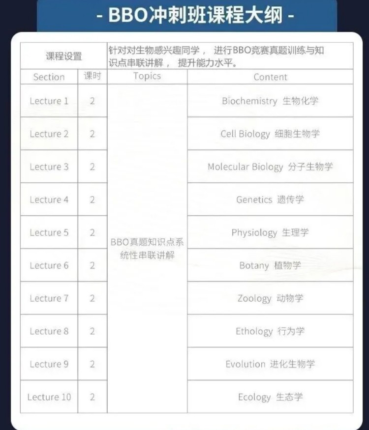 班课设置:BBO基础班60h、BBO强化班60h、BBO冲刺班30h、BBO特训班10h、USABO&BBO直通车班型120h