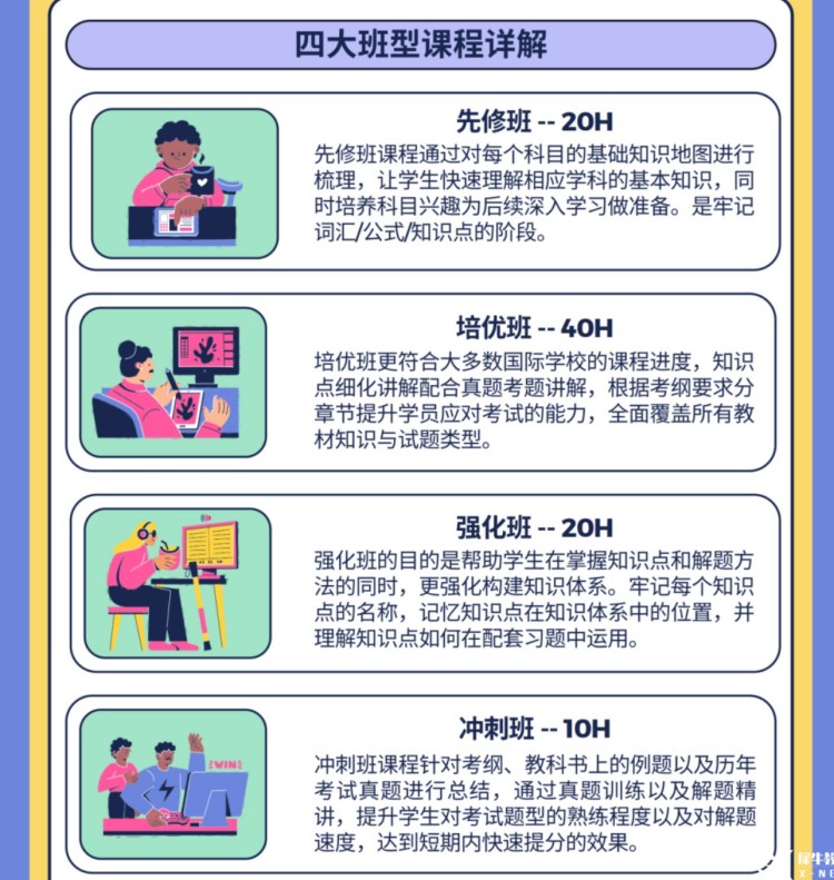 培优班更符合大多数国际学校的课程进度,知识点细化讲解配合真题考题讲解,根据考纲要求分章节提升学员应对考试的能力,全面覆盖所有教材知识与试题类型。