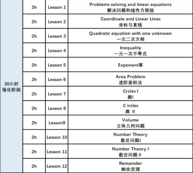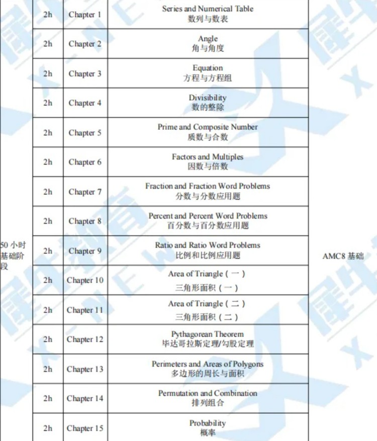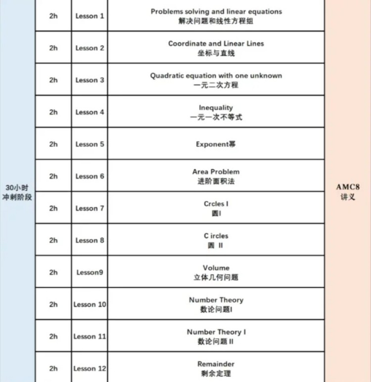 | AMC8预备班 | 50h | G1-G3,夯实基础 |