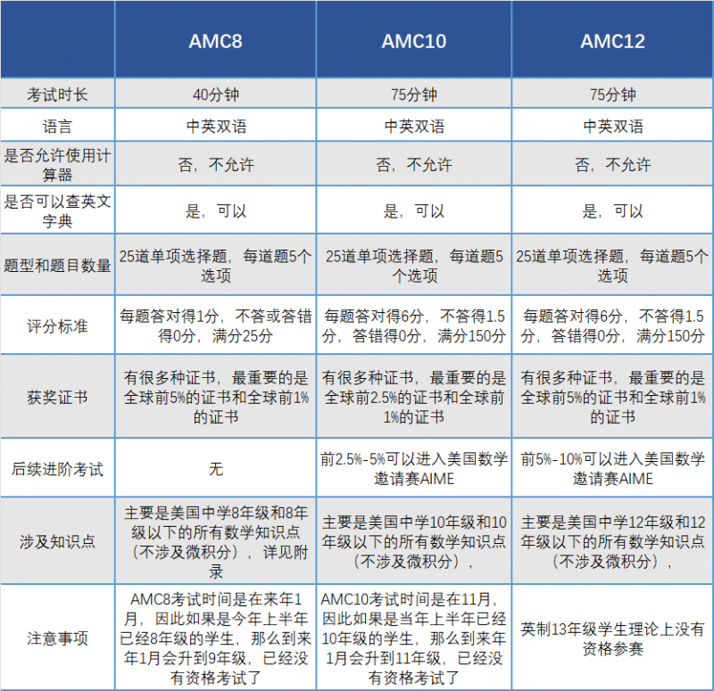 AMC有3种等级考试:AMC8/AMC10/AMC12,分别允许不超过8/10/12年级的学生参加,美国及其他地区均可参加。AIME(美国数学邀请赛)则是由在AMC10和AMC12中成绩优异的同学晋级参加。